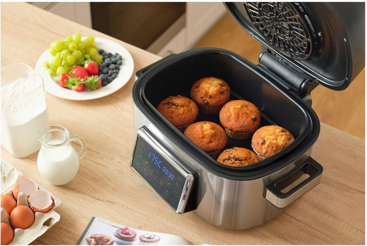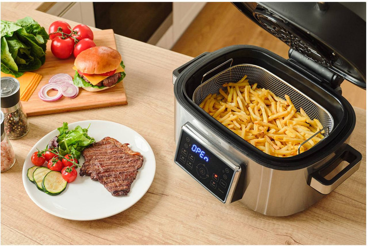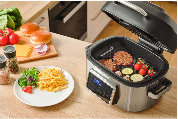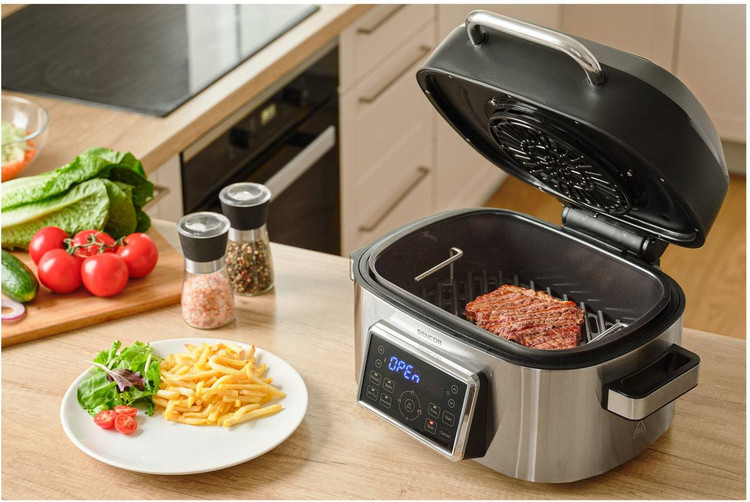 این گریل شبیه به سرخکنهای بدون روغن، شامل یک المنت و فن موثر در بخش بالایی دستگاه است. همچنین یک المنت دیگر در کف دستگاه نصب شده است که به همراه المنت بالایی، باعث پخت یکنواخت از هر دو طرف مواد غذایی میشود. با توجه به طراحی ویژه و مهندسی، هوای گرم به یکنواختی درون سبد گردش میکند. دمای آن نیز قابل تنظیم از 45 تا 265 درجه سانتیگراد است. در صورت لزوم، میتوان با استفاده از یکی از فنهای دلخواه، پخت را انجام داد. توان این دستگاه 1660 وات است و در زمان کوتاهی آماده به کار خواهد بود. همچنین، فن دارای صدای نسبتاً کمی است و برای ساکنان منزل مزاحمتی ایجاد نمیکند.