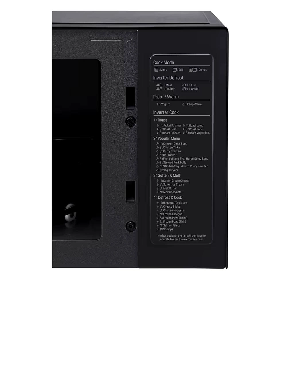 5 برنامه پختن و کباب کردن – 4 برنامه یخ زدایی آرام – 2 برنامه گرم نگه داشتن غذا – 4 برنامه یخ زدایی با تکنولوژی اینورتر – 8 برنامه پخت / یخ زدایی – 16 برنامه پخت غذاهای متداول
